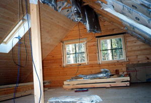 ログハウス完成建具も入って、ほぼ完成! ![]() 後はテラスに外階段を取り付ける作業が残っているだけ。 ![]() 1Fは、ワンフロアの広いリビンク&キッチン。 ![]() 冬は薪ストーブが活躍する。 ![]() 余り材で作ったカウンターをダンニングテーブルとして利用。 ![]() そして、ロフトには個室2部屋を確保した。 |