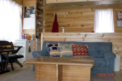 建築中に作業小屋『サムソーヤ』で待機していたソファも、ログハウス内部にお引越しです。