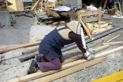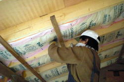 外付け部分の窓取付時に使う板材を研磨したり、できあがった屋根内側に断熱材を付たりしました。