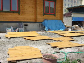 「より鮮やかになりました〜!」 ログハウス内部にもひたすら保護のためのオイル塗り・・・ 使用したオイルは「ワコトオイルフィニッシュ W04 ナチュラル」です。 内部塗装は、やはり天井塗りが一番大変でした。 全部を2度塗りすると、飽きます〜。 でも、ガンバリマシタ!! そして私、パワフル奥さんの 1ヶ月に及ぶ春休みは終わり、現場を後にすることに・・・。 一方、彼はすっかり作業にはまってしまい、一人残って増築作業を続行!! ということで、外付けバスルーム増築についての説明は彼にバトンタッチ・・・です。